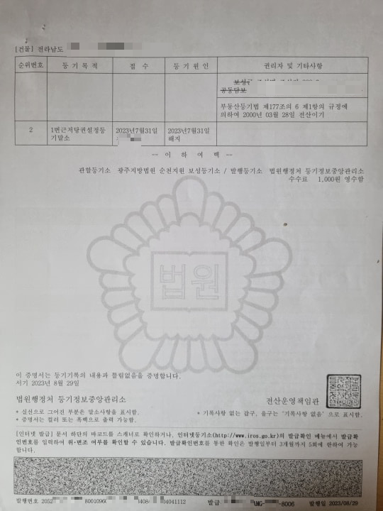 지금까지 근저당 말소 등기를 직접 신청하는 방법을 알아보았는데요 등기소 접수 후 보통 2~3일 후 등기부등본을 발급받아보면 아래와 같이 근저당권이 말소된 것을 확인할 수 있습니다.