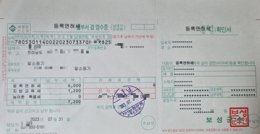 2. 등록면허세, 지방교육세 영수증: 시, 군, 구청 종합민원실에서 발부받아 시,군,구청 내 은행에서 납부