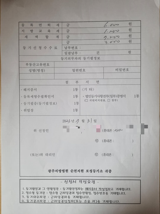 5. 관할 등기소 방문: 근저당권말소등기 신청서 작성(미리 작성 추천) 후 위임장, 해지증서, 등기부등본, 등록면허세 및 지방세 납부 영수증, 등기신처수수료 납부 영수증 첨부하여 신청하면 끝