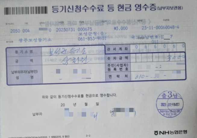 3. 등기신청수수료 영수증: 시,군,구청 내 은행에 납부