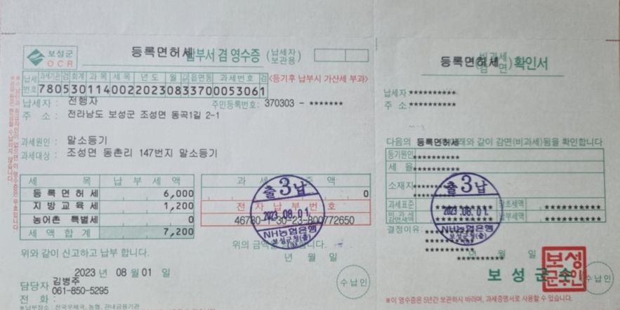 군(시,구)청 종합민원실을 방문하여 등록면허세 납부서 겸 영수증을 발부받아, 군(시,구)청 내 은행에서 납부(등록면허세: 6,000원, 지방교육세: 1,200원)