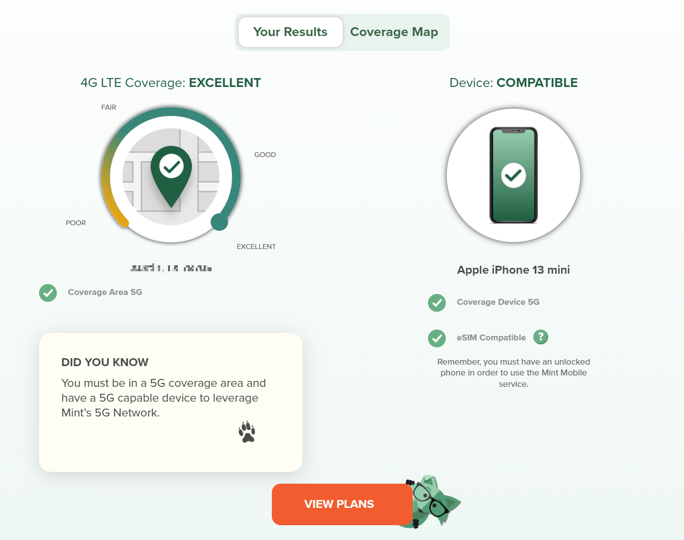 모든 정보를 입력하셨다면, 해당주소에서 해당 휴대폰이 민트모바일을 통해 4G LTE 와 5G가 정상적으로 작동하는지 확인할 수 있습니다. 확인이 끝나셨다면, VIEW PLANS를 눌러줍니다.