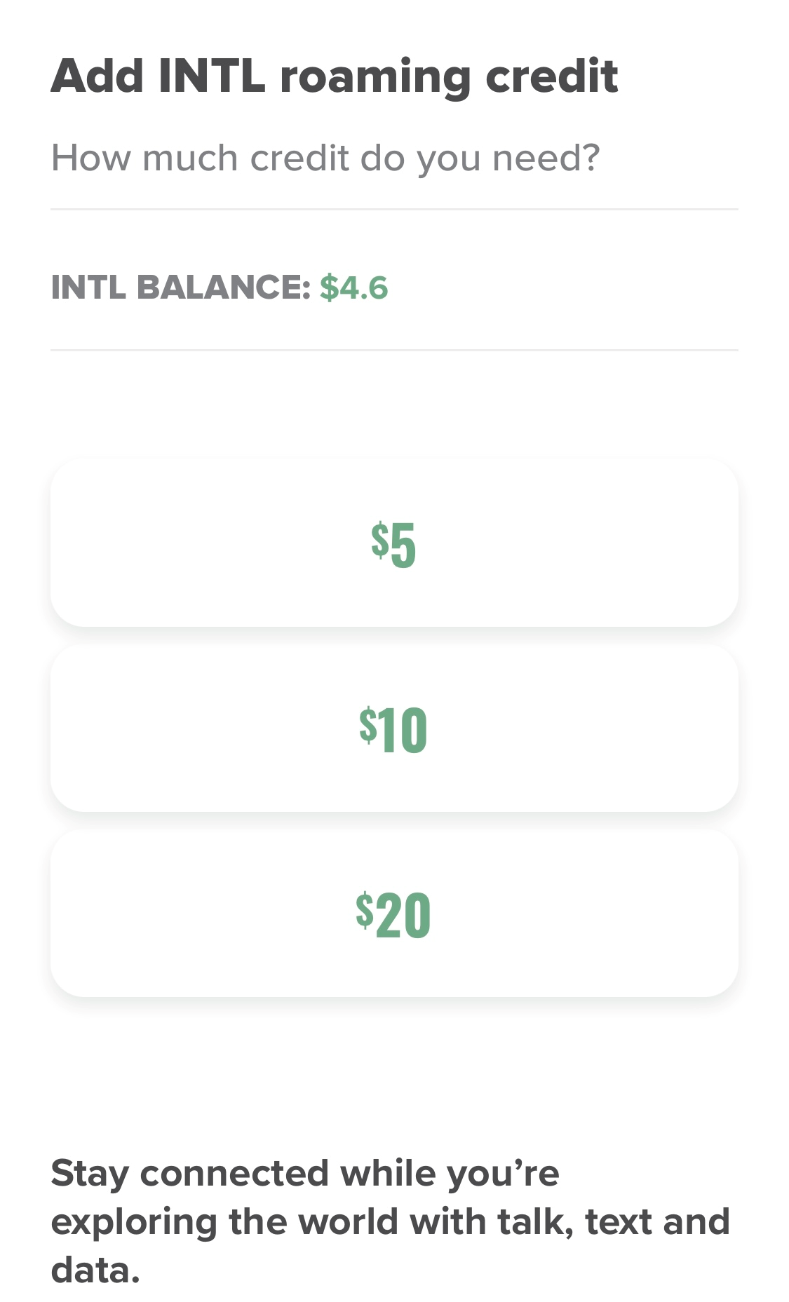 민트모바일 앱에 로그인한 후 오른쪽 하단 Account - Add INTL roaming credit을 클릭하시면 $5, $10, $20의 크레딧을 충전하실 수 있습니다. 필요하신 만큼 선택 후 결제하면 한국에서도 수신, 발신, 데이터 접속이 가능해집니다. 개인적인 경험으로 간단한 연락 수신에는 $5충전만으로도 충분했습니다. 타 통신사 대비 매우 저렴한 가격으로 이용할 수 있기 때문에 개인적으로 민트 모바일(Mint mobile)을 강력하게 추천합니다.