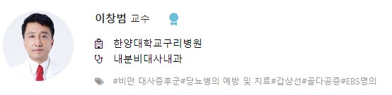 이상으로 고혈압, 고지혈증, 당뇨의 예방과 치료에 도움을 받을 수 있는 EBS 방송 "명의"에 출연했던 전문의를 소개해 드렸습니다. 위의 3대 대사성질환은 정기적인 건강검진을 통하여 확인이 가능하고, 건강한 식습관과 규칙적인 운동으로 충분히 예방할 수 있는 질환입니다. 예방과 치료에 도움이 되었으면 좋겠습니다.